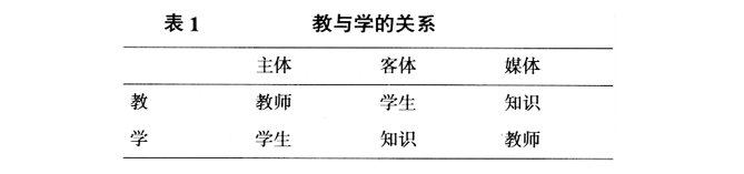 由图2可知,备课的要求涉及17个字:三的(三个目的)、三点、三实际、二基本、一灵活、纵横联系。而讲课的要求是在讲、写、作、画、演等五个字上下工夫,讲课过程中讲究教师语言的艺术。上海市优秀教师经验表明教师应在“12个字”语言要求上下工夫。确切、明白、简洁、通俗、优美、形象。此外,要处理好六大关系:德、智、体、美的关系;讲和练的关系;尖子员工和一般员工的关系;留作业与批改作业的关系;课内与课外;校内与校外的关系,以及教与学的关系。教与学的关系,如表1所示。