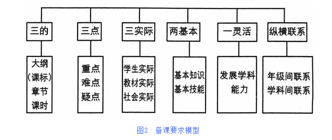 教育的主渠道在课堂,教师的教学能力显得十分重要。课堂教学效果的标准为:(1)教学目标;(2)动机激发;(3)课堂组织;(4)知识呈现;(5)提问设计;(6)练习设计;(7)评估调控;(8)艺术水平。这是教学能力高低的集中表现。教师的教学能力还表现在其课堂教学的基本功上,即表现在备课、讲课和处理教学的若干关系上。备课的要求,可归纳为图2的模型。