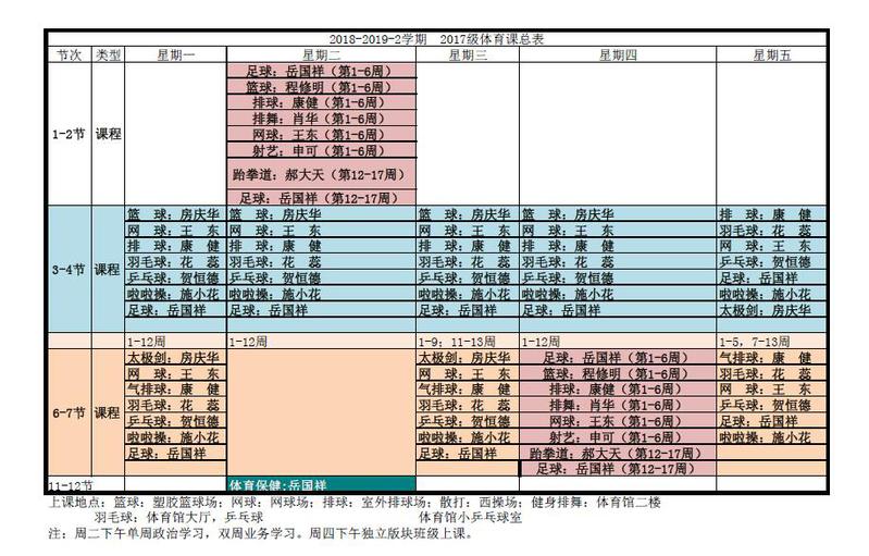 2018-2019-2学期体育课总表