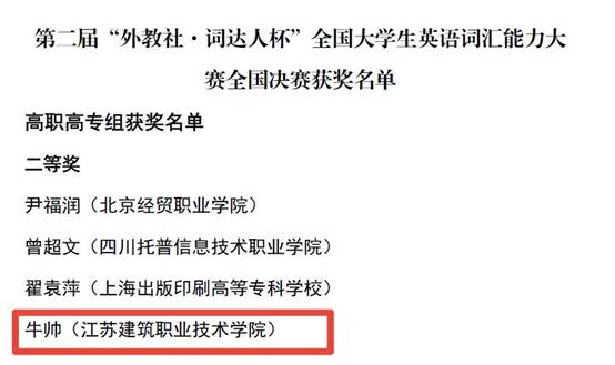 近日,第二届“外教社·词达人杯”全国老员工英语词汇能力大赛全国决赛获奖名单公布,由公司孟红霞老师指导的机制社19-1班牛帅同学荣获高职高专组二等奖。