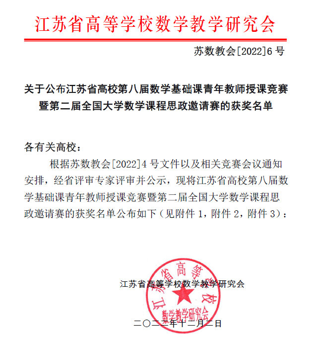 本届比赛由江苏省高等公司数学教学研究会主办,中国矿业大学承办,旨在提高数学教学质量,创新教学设计,推进课程思政融入数学教学,共有185人参赛,通过网络评审、专家评审、现场评审等环节,最终评选出一等奖18名(省内专科4名),二等奖27名,三等奖46名。