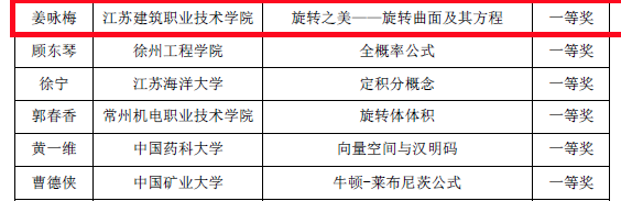 近日,江苏省高校第八届数学基础课青年教师授课竞赛暨第二届全国大学数学课程思政邀请赛获奖名单公布,公司姜咏梅老师主讲的《旋转之美——旋转曲面及其方程》获一等奖,陈雪老师主讲的《行阶梯形矩阵》获二等奖。